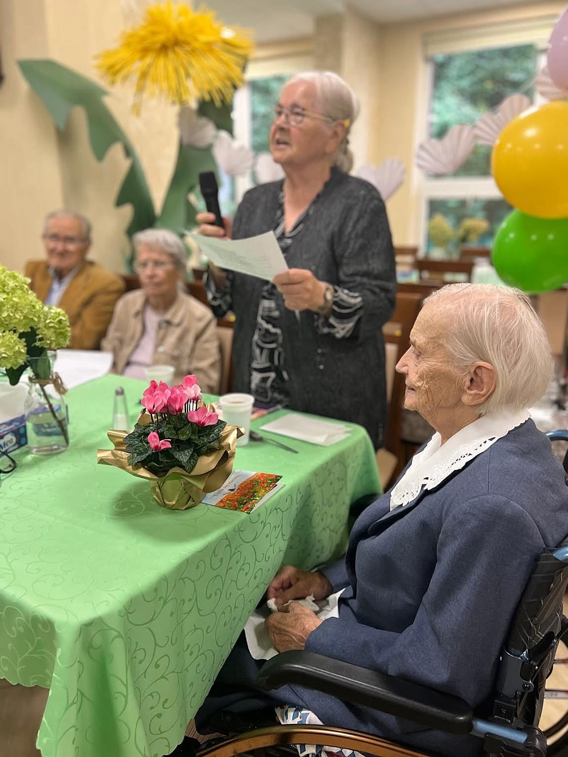 Nasza 101-latka Marianna Mazur doczekała się osobnej kameralnej uroczystości w pracowni terapii zajęciowej. Najpierw solenizantce złożył życzenia emerytowany pastor, a następnie przedstawicielka mieszkańców. Był też drobny prezent – preparat na wzmocnienie stawów. Może sekretem długowieczności pani Marianny jest życie wypełnione pracą w gospodarstwach rolnych, a może wyjątkowa pogoda ducha i optymizm? Jedno jest pewne – kondycji umysłowej i fizycznej mógłby jej pozazdrościć niejeden z młodych.